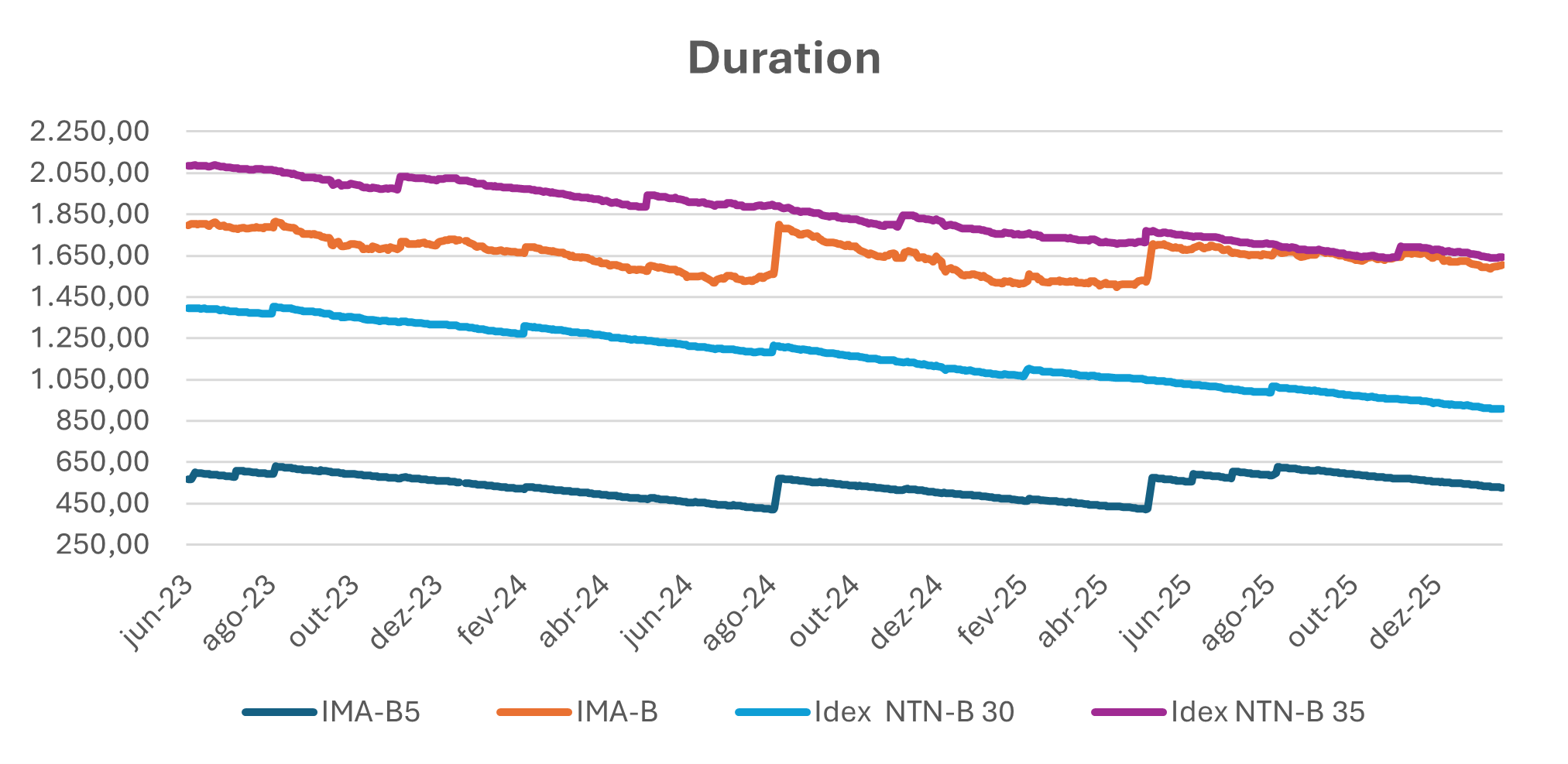 No caso específico dos índices IMA-B 5, IMA-B e IMA-B5+, os recortes são feitos em relação ao prazo até o vencimento de cada NTN-B. O IMA-B5 é composto pelas NTN-Bs que vencem em até 5 anos, o IMA-B5+ pelas que vencem em um prazo superior a 5 anos e o IMA-B pelo total das NTN-Bs.