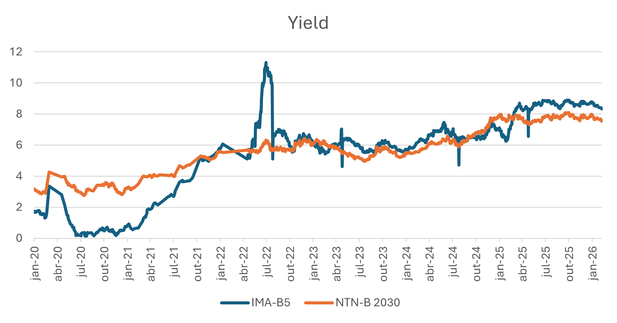 No caso do yield, os índices mais curtos, como o IMA-B5 e suas variações, tendem a ser mais impactados pelo peso dos papéis muito curtos. Neste caso, o yield oscila muito, refletindo as expectativas de inflação para o último mês até seu vencimento, causando a volatilidade vista no gráfico abaixo.